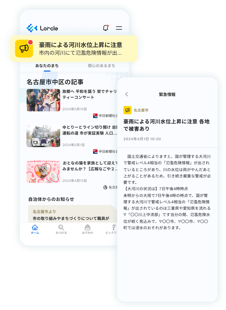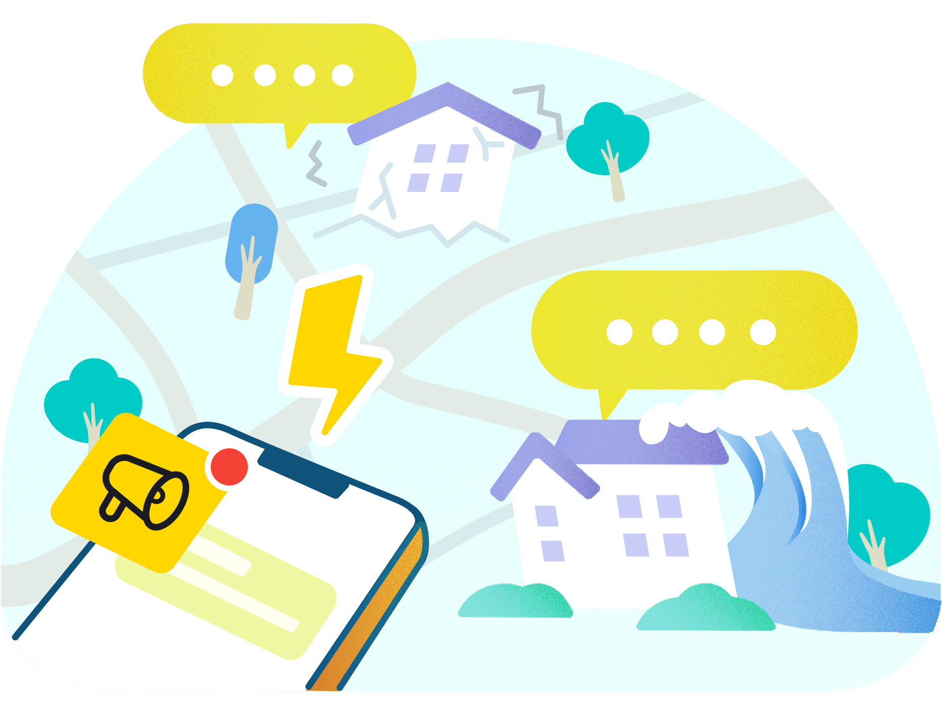 地震・豪⾬などの災害情報や安全に関わる緊急情報を⾃治体から発信します。